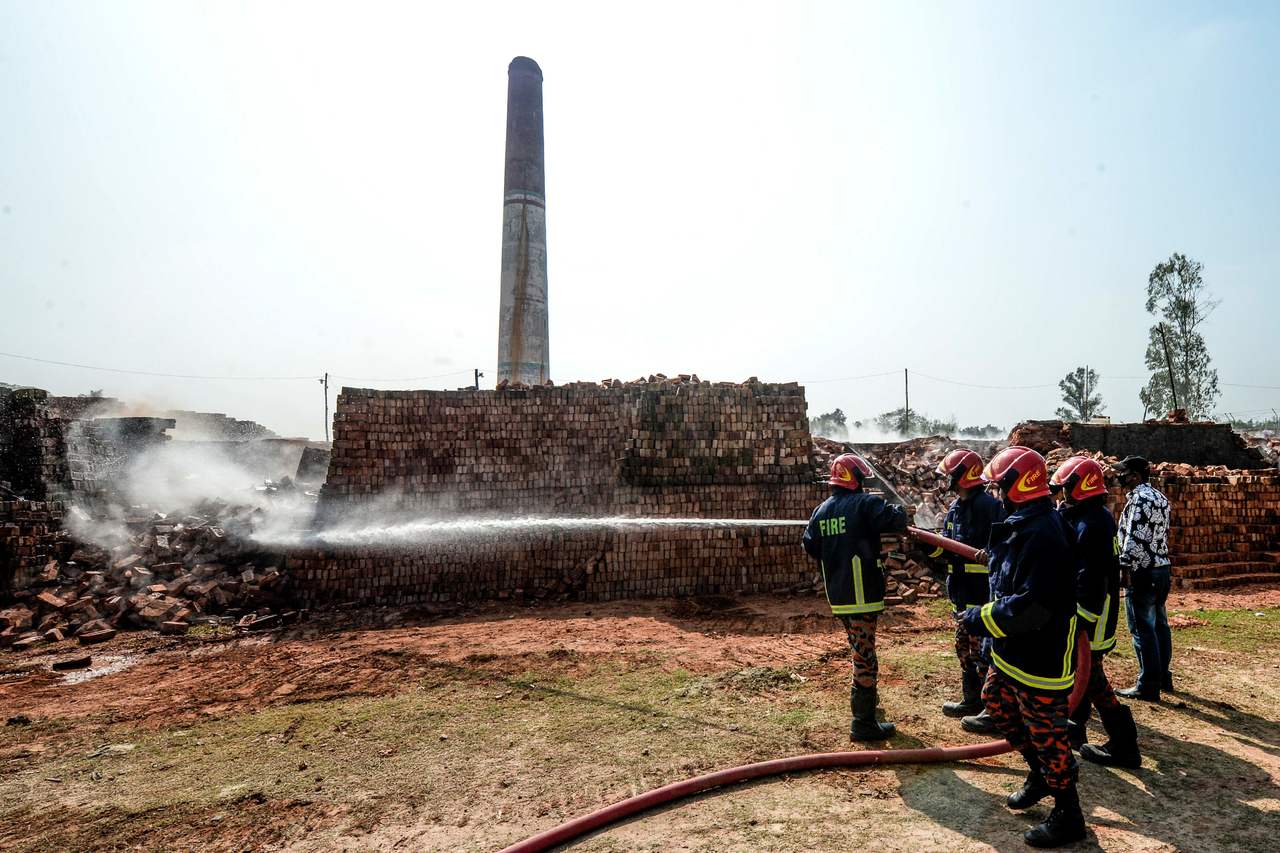 In a photo taken on Dec 4, 2019, firefighters spray water over a brick kiln as local authorities prepare to demolish illegal brick kiln on the outskirts of Dhaka.