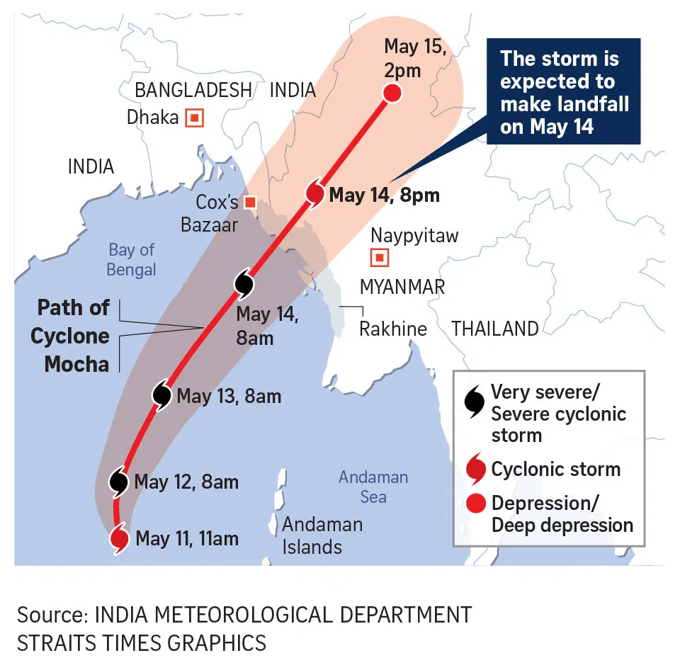 Cyclone Mocha is forecast to make landfall on Sunday along the Bangladesh-Myanmar border, according to India’s meteorological office, packing winds of up to 145 kmh.