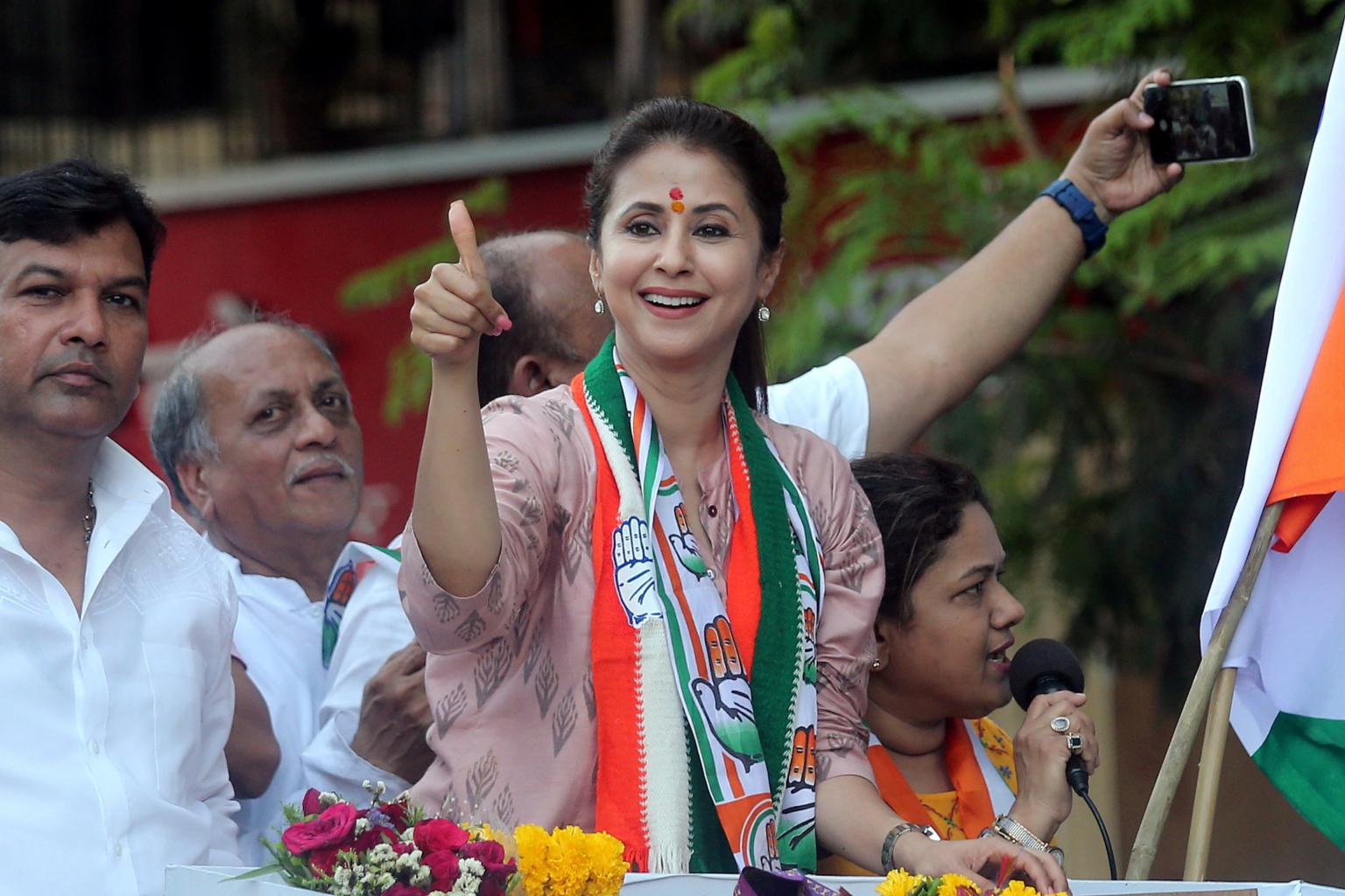 Bollywood actress Urmila Matondkar, who recently joined India's main opposition Congress party, gestures during her election campaign rally in Mumbai, India, on April 11, 2019.