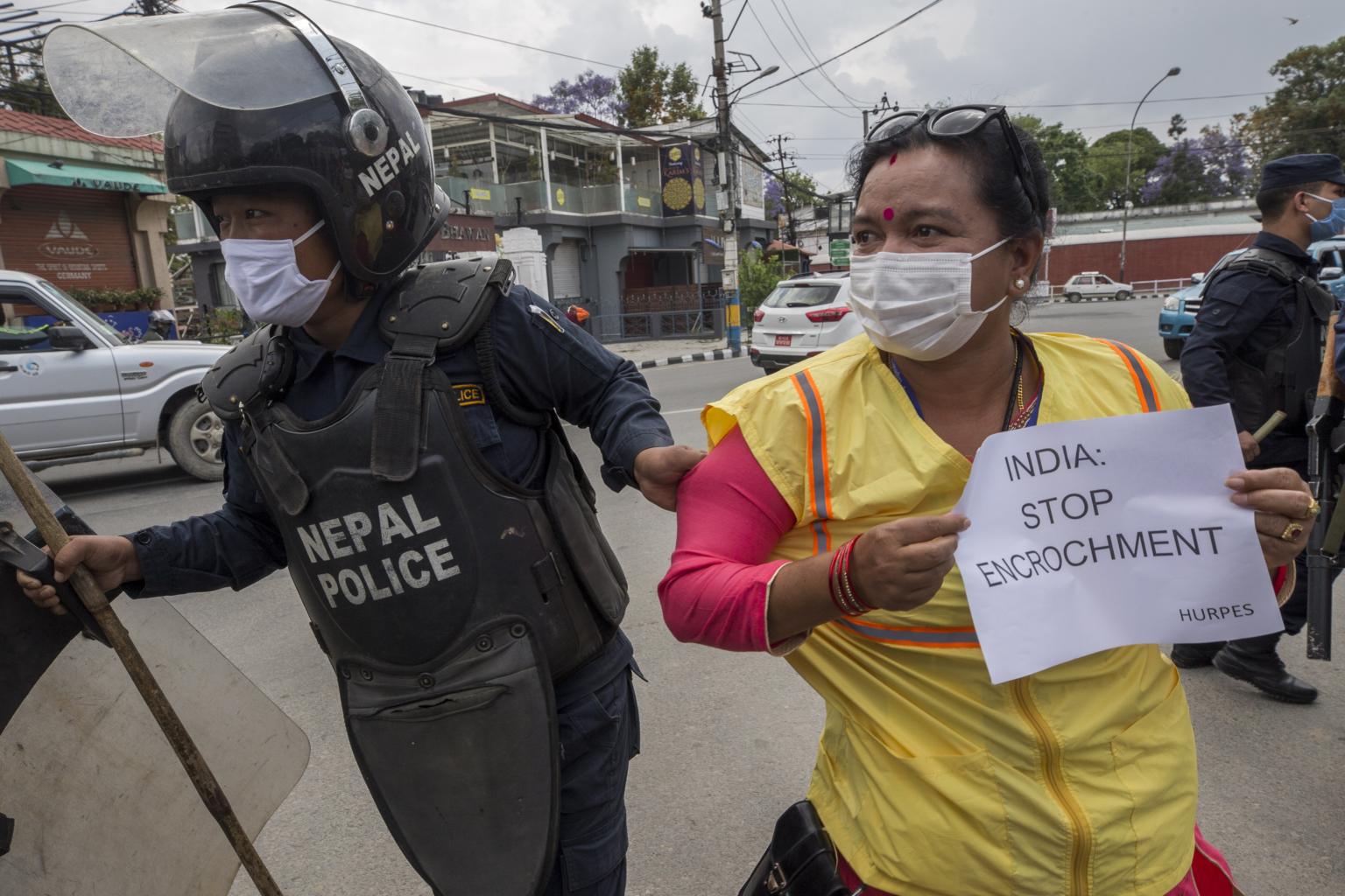 An activist being detained by police during a protest at the Indian embassy in Kathmandu on May 12, 2020.