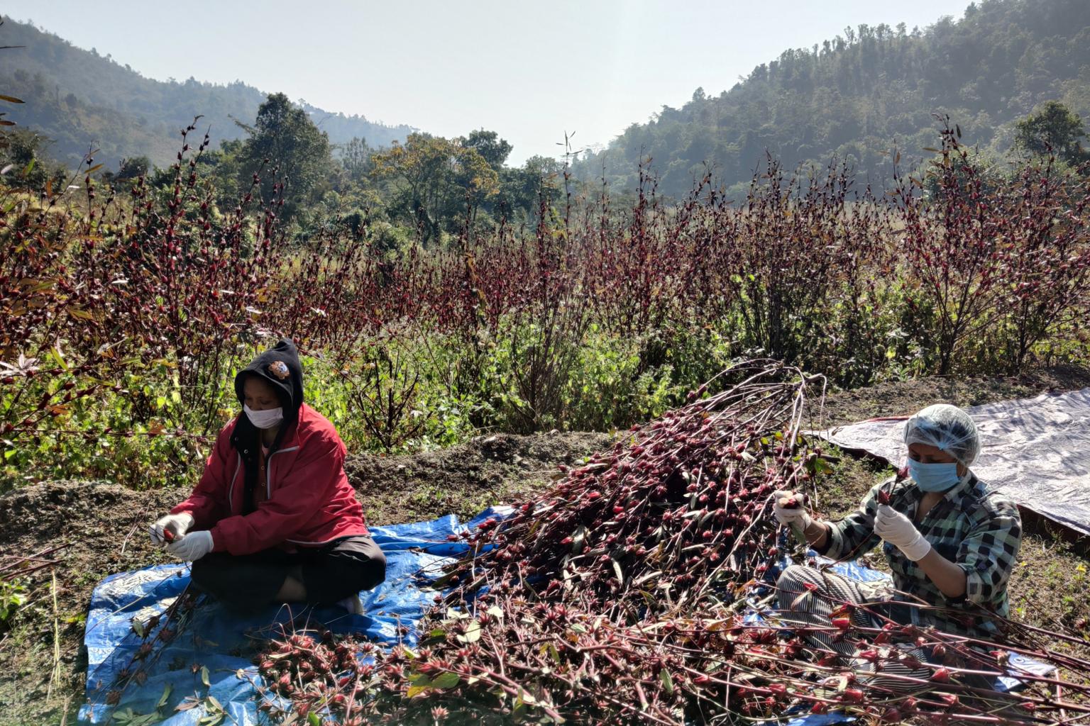 Women harvesting roselle flowers used in one of Dweller Teas’ infusion blends. The firm, which churns out 5,000 packets of tea bags every month, employs 23 people – 19 of them women.
