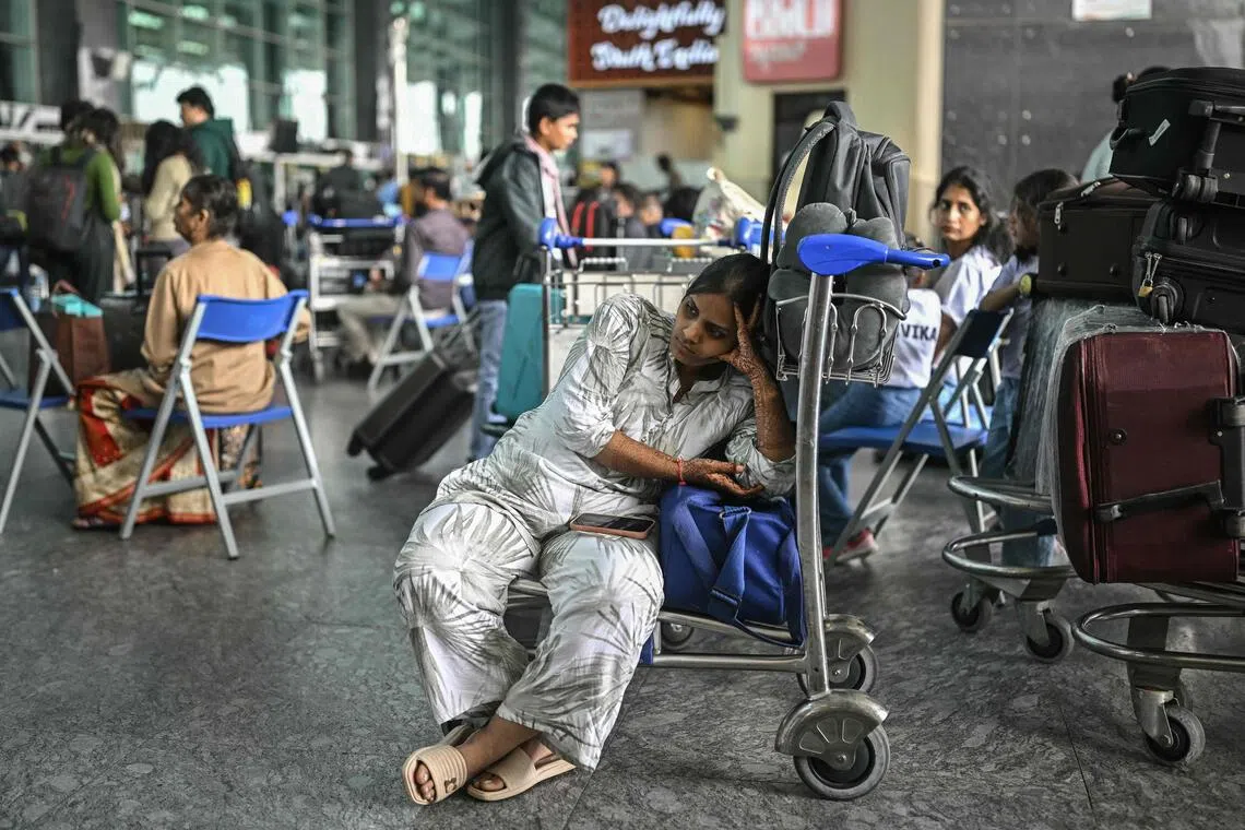 A passenger waiting outside the IndiGo kiosk at the airport in Bengaluru on Dec 6.