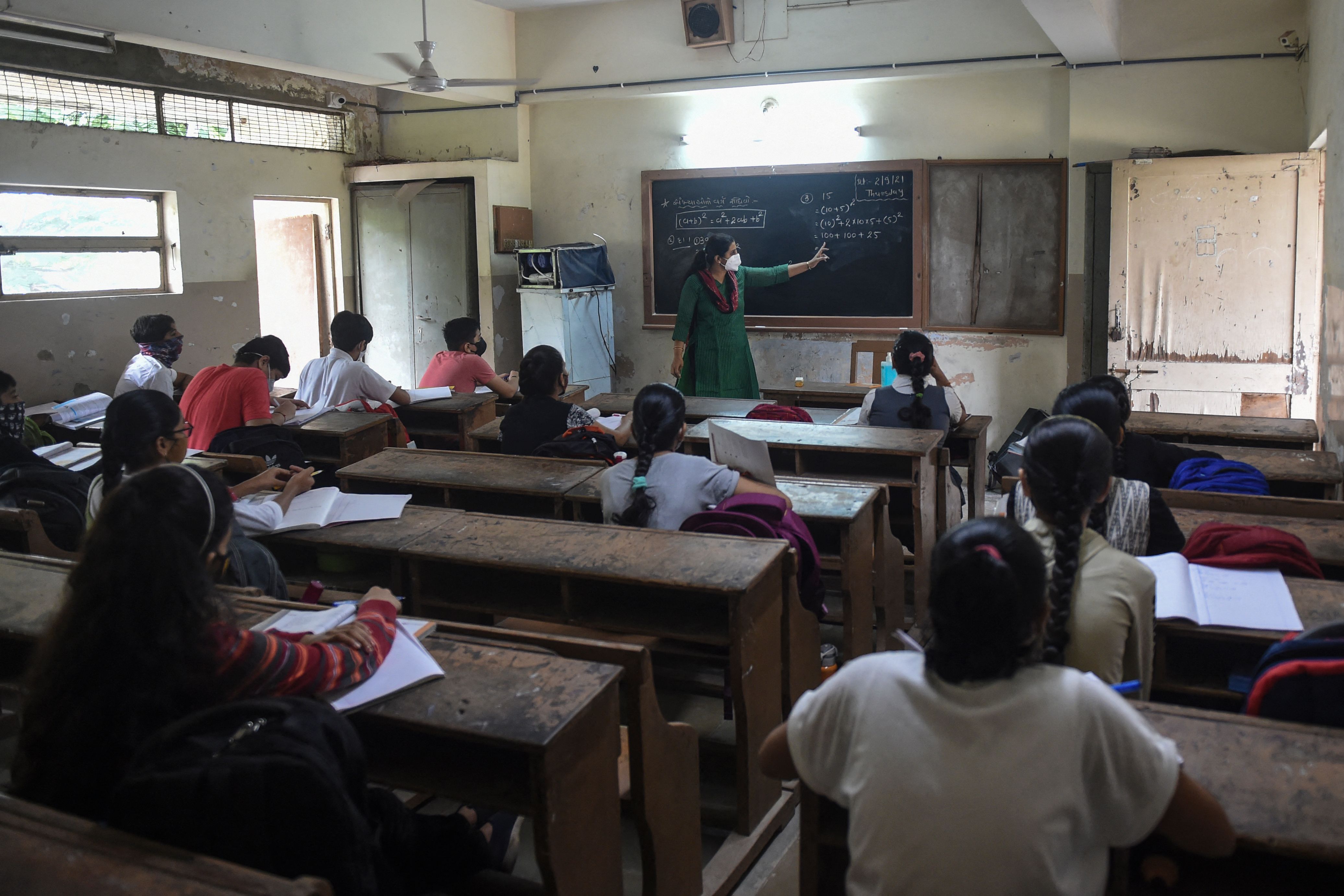 A teacher holds a lesson for students at Navrang School, in Ahmedabad on Sept 2, 2021.