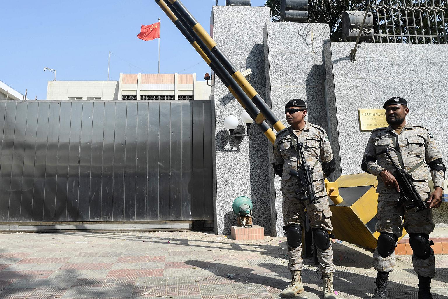 Pakistani rangers stand in front of the Chinese consulate after an attack in Karachi, on Nov 23, 2018.