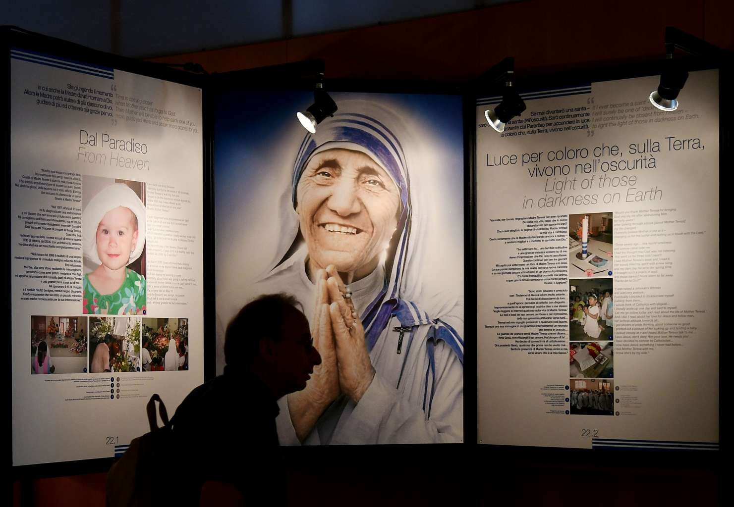A visitor passing by pictures of Mother Teresa during a photograph exhibition held in Rome on Sept 1, 2016.