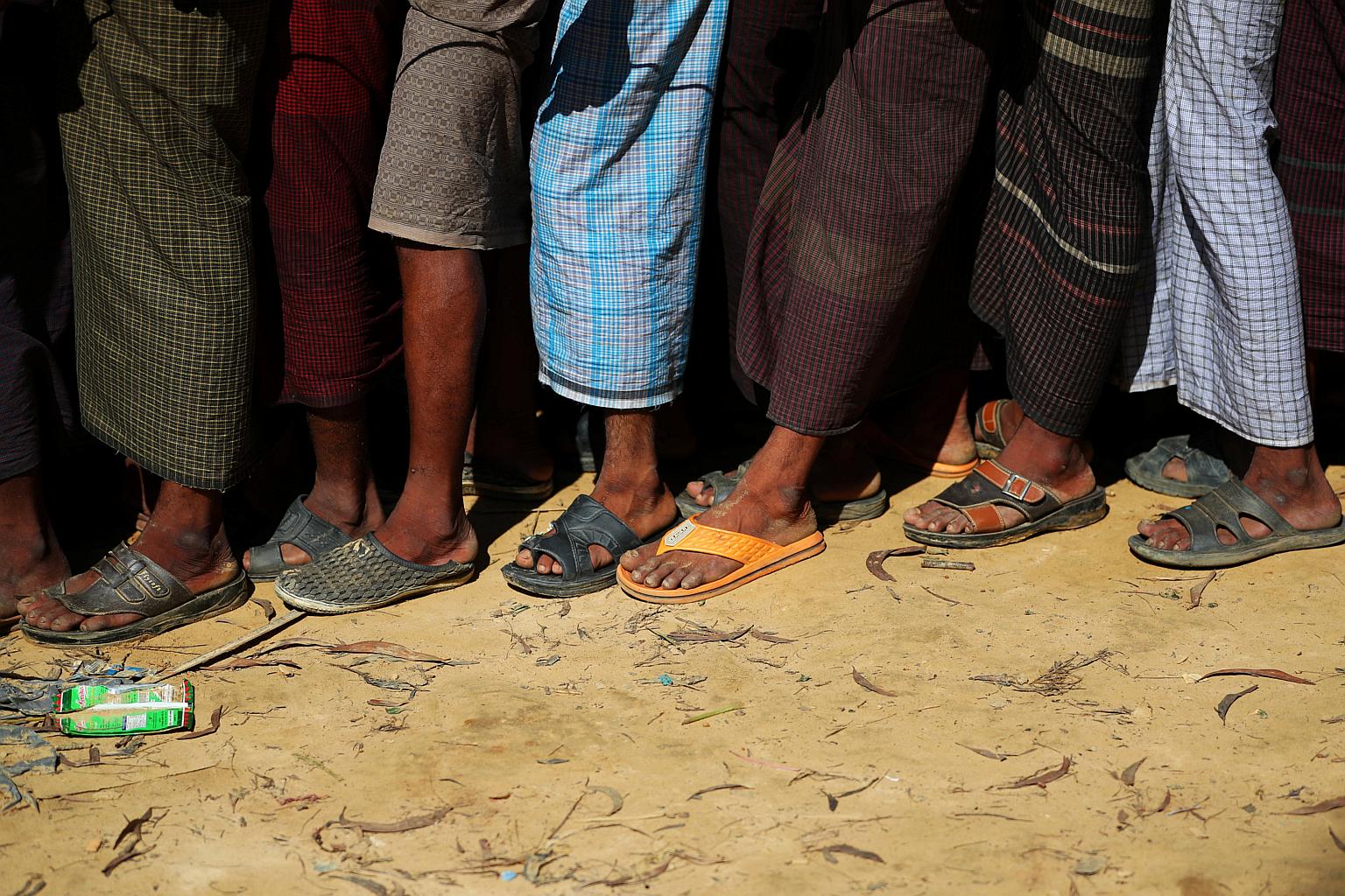 Rohingya refugees line up to receive humanitarian aid in Kutupalong refugee camp near Cox's Bazar.