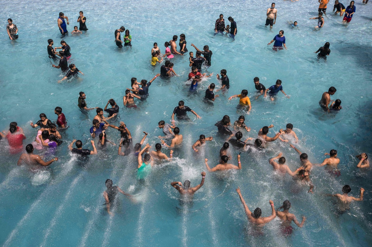 <p>People cool off in a wave pool during a hot summer day at a water park in New Delhi on April 30, 2022. (Photo by Xavier GALIANA / AFP)</p>
