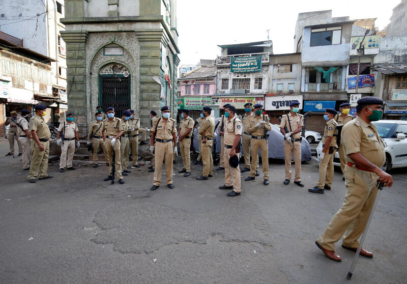 Policemen stand guard in a neighborhood after dozens were taken to a quarantine facility in Ahmedabad, India, on April 6, 2020.