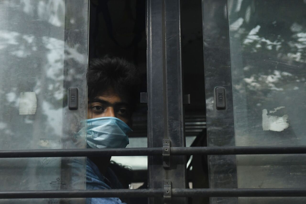 A student sits inside a special government bus during a government-imposed nationwide lockdown in Kolkata on May 1, 2020.