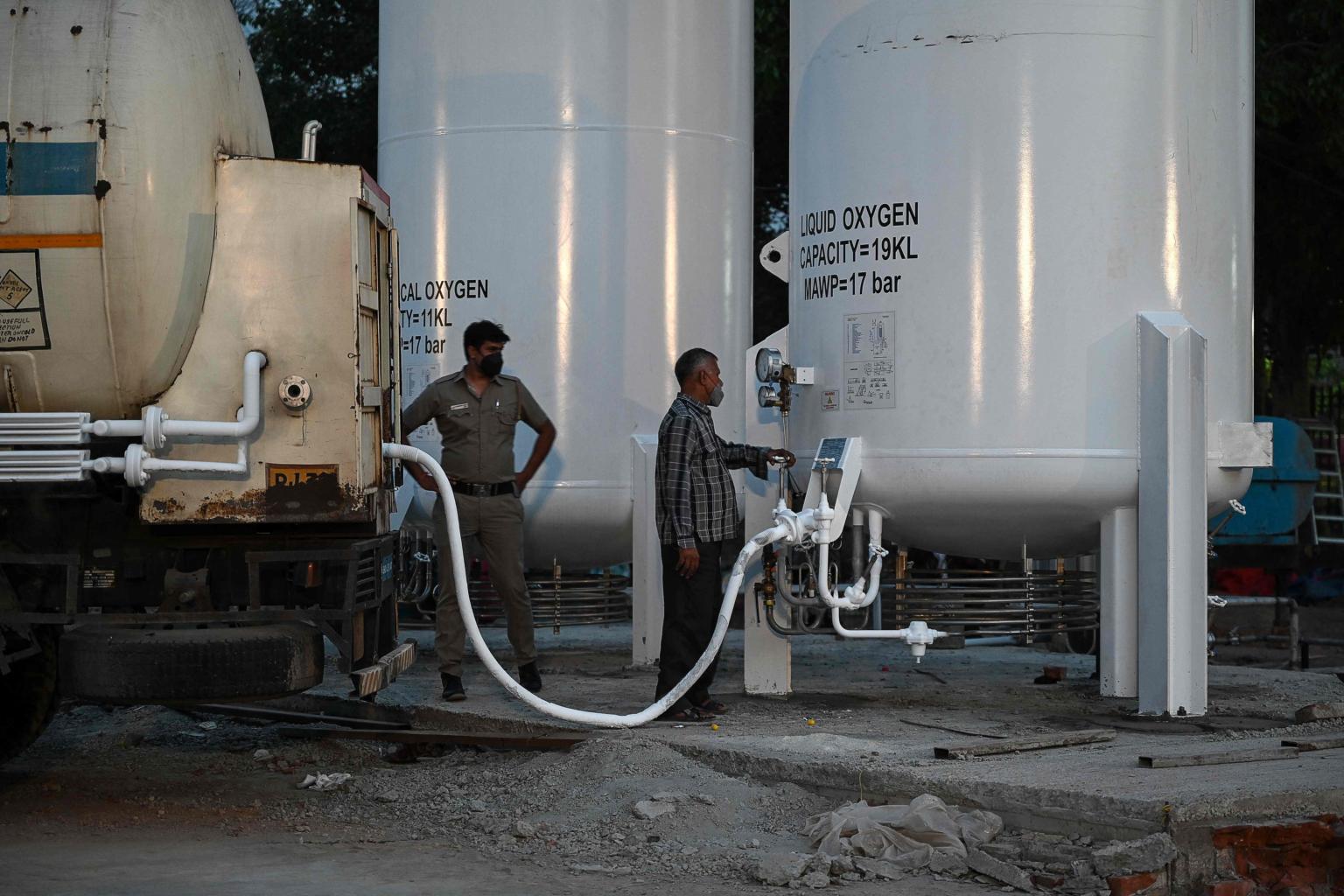 Workers load oxygen into newly installed tanks to be used for Covid-19 patients in New Delhi on May 12, 2021.