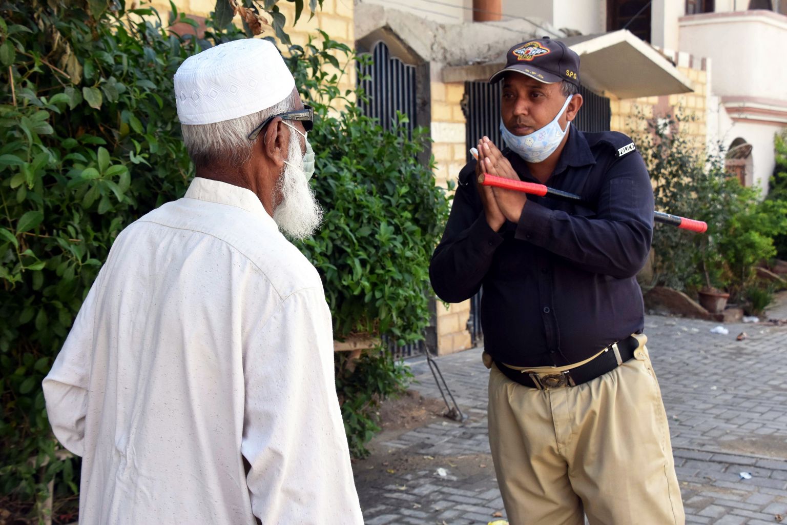 A Pakistani security official (right) requests a man to return home outside a closed mosque in Larkana, Pakistan, March 27, 2020.