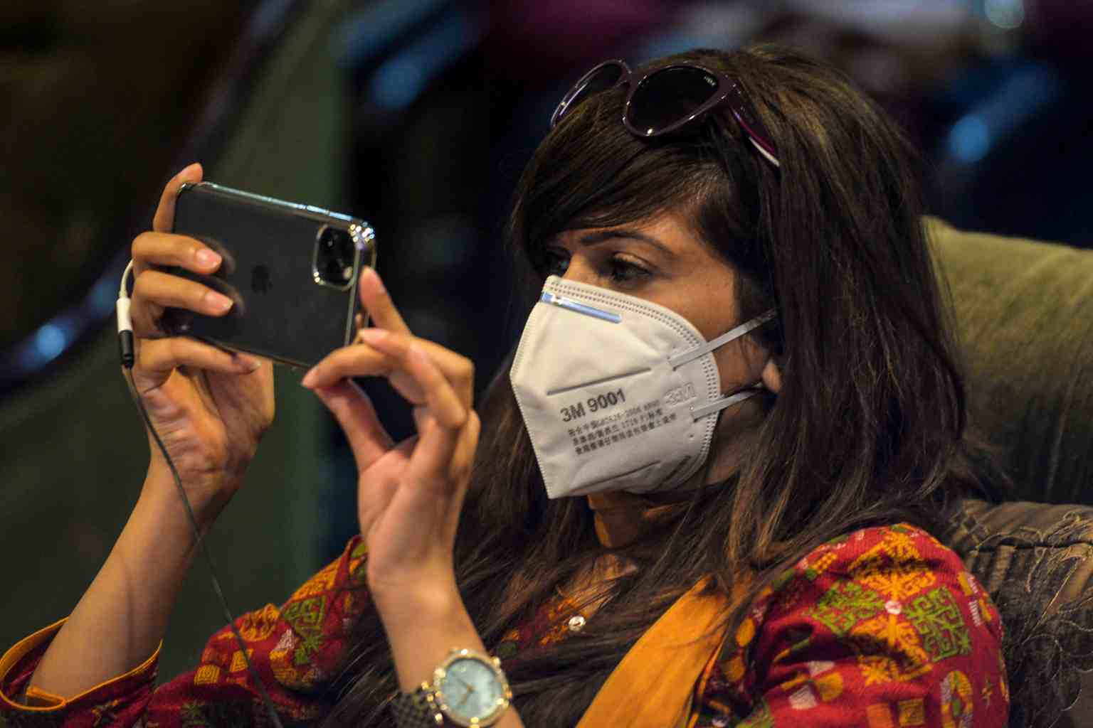 In a photo taken on March 10, 2020, a journalist wearing a face mask as a prevention measure against the Covid-19 coronavirus uses her smartphone as she attends a press conference with the organisers of a women's march, in Islamabad, Pakistan.