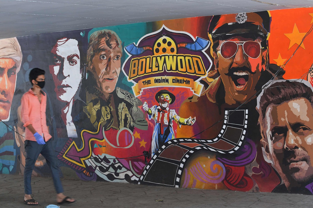 A man walks past a wall mural of Bollywood actors in Mumbai. on May 8, 2020.