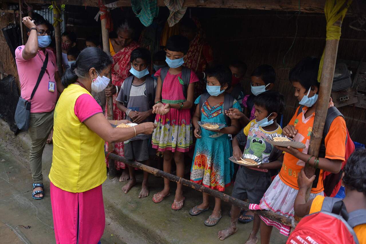 Children from a low-income neighbourhood receiving food distributed by a non-profit organisation, on the outskirts of Siliguri, India, on July 23, 2021.