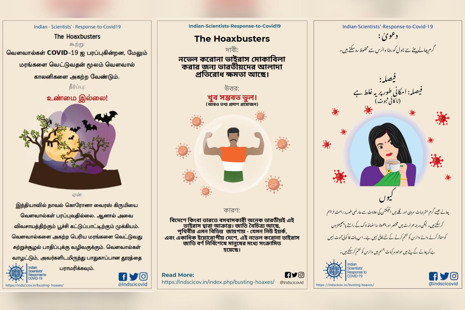 The broadest effort, however, comes from the Indian Scientists' Response to Covid-19 (ISRC), a group of over 700 scientists, researchers and engineers across the country. The task force also includes translators, hoax busters, designers and illustrators who work in 19 languages including Konkani, Tamil, Malayalam, Hindi, Bengali, Assamese, Urdu and Meitei.