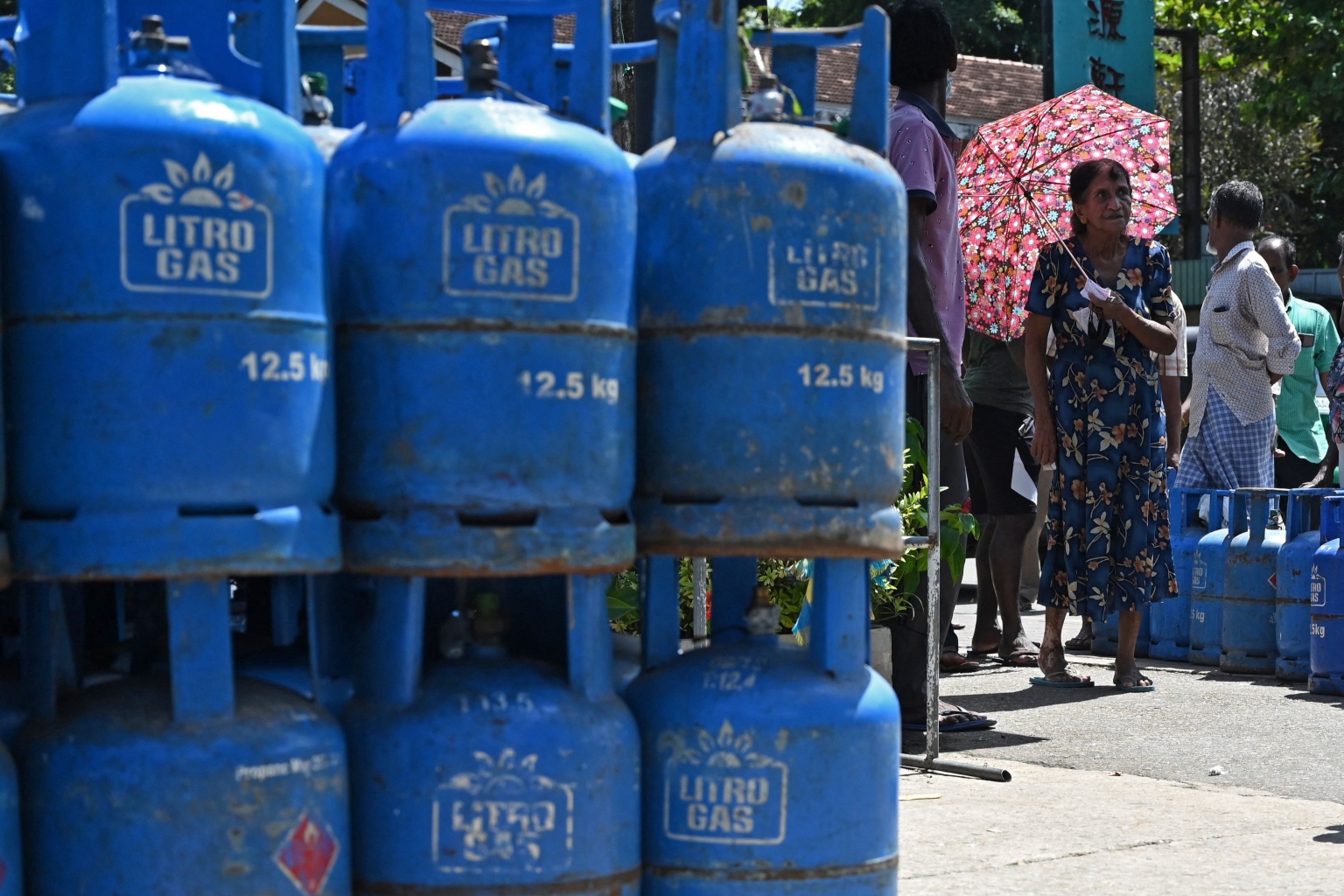 People wait to refill Liquefied Petroleum Gas cylinders at a gasoline distribution point in Colombo, on July 14, 2022.