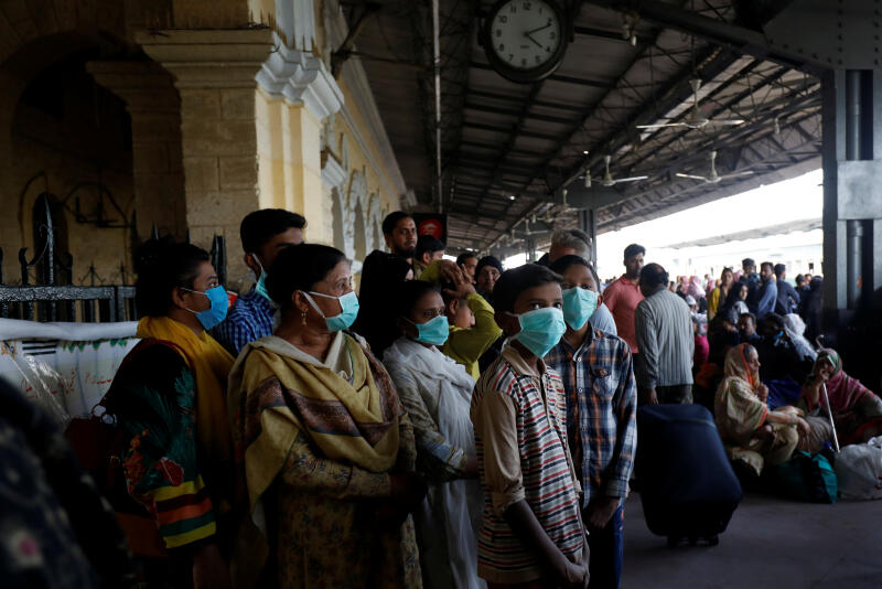 Women and children wear protective masks while waiting for a train at the Cantonment railway station in Karachi, Pakistan, on March 15, 2020.