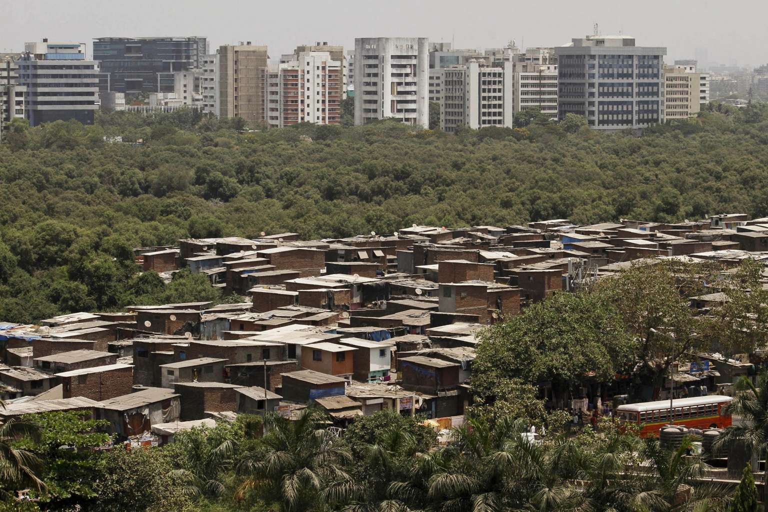 High-rise buildings stand behind slum dwellings in Mumbai on May 9, 2012.