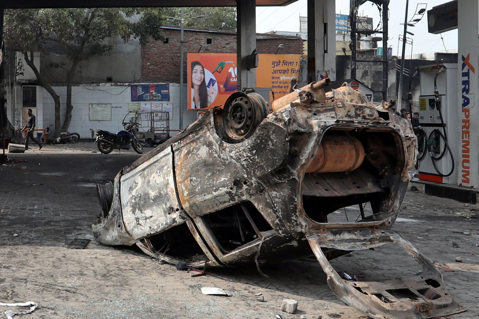 A photo taken on Feb 26, 2020 shows a burnt car overturned at a damaged fuel station after it was set on fire by a mob in a riot-affected area in New Delhi.