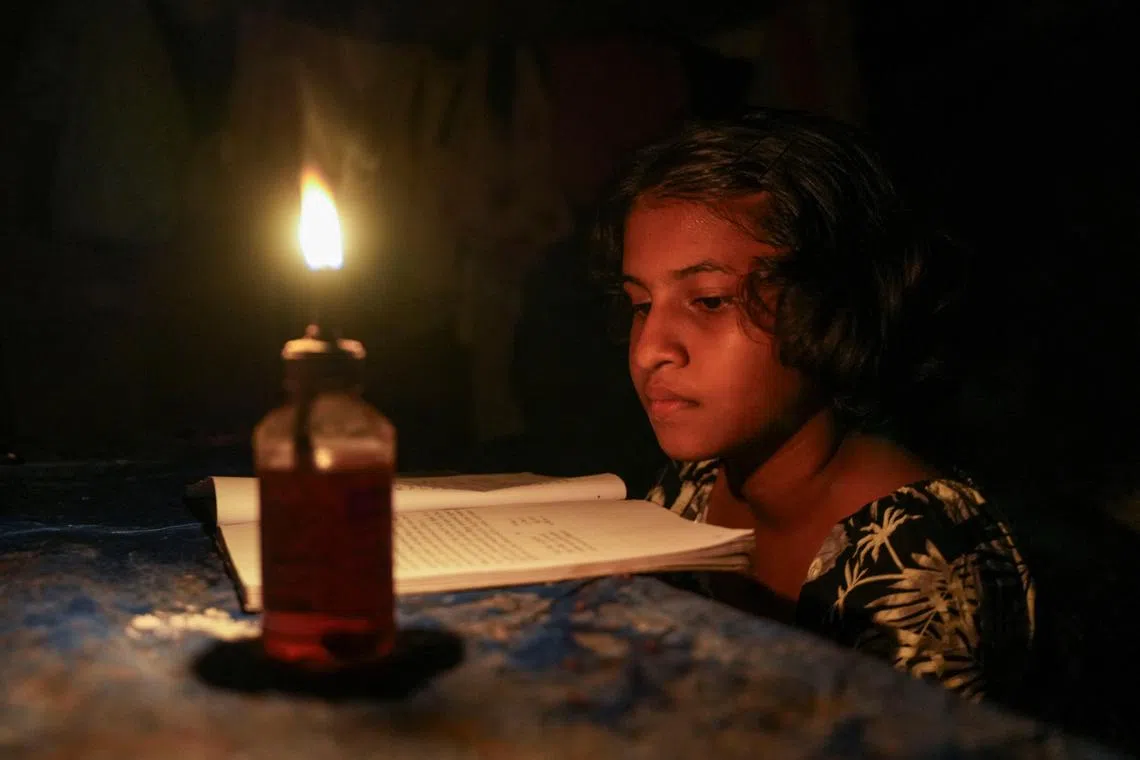 Menuli Damsandi, aged 12, reads a book via lamplight inside the room of her house in Hambantota, Sri Lanka on Oct 28.