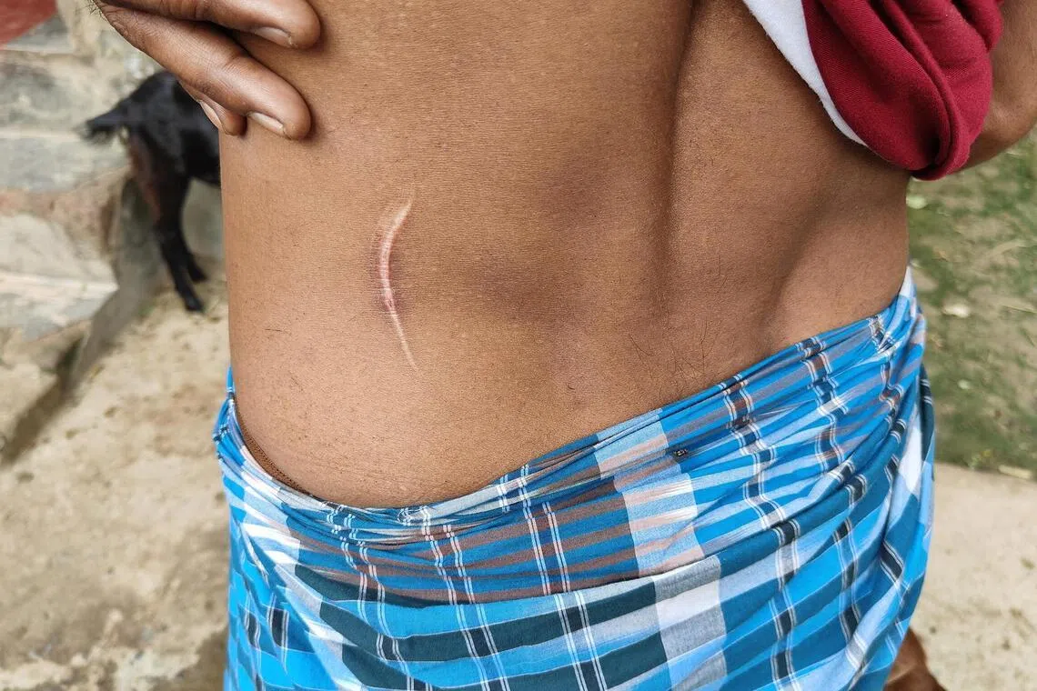 Mr Mehebub Sheikh showing an injury he claimed to have received when he crawled back into India through the border fence.