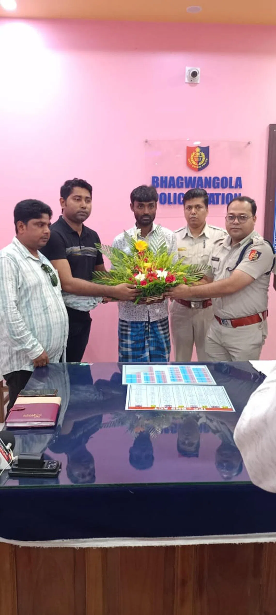 Mr Mehebub Sheikh being welcomed back by the local police in West Bengal.