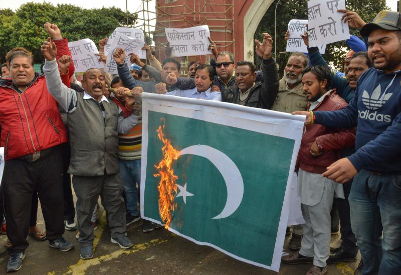 Activists from the All India Anti-Terrorist Front protest against Pakistan in Amritsar, India, on Feb 15, 2019, the day after an attack on a paramilitary Central Reserve Police Force convoy in Kashmir.