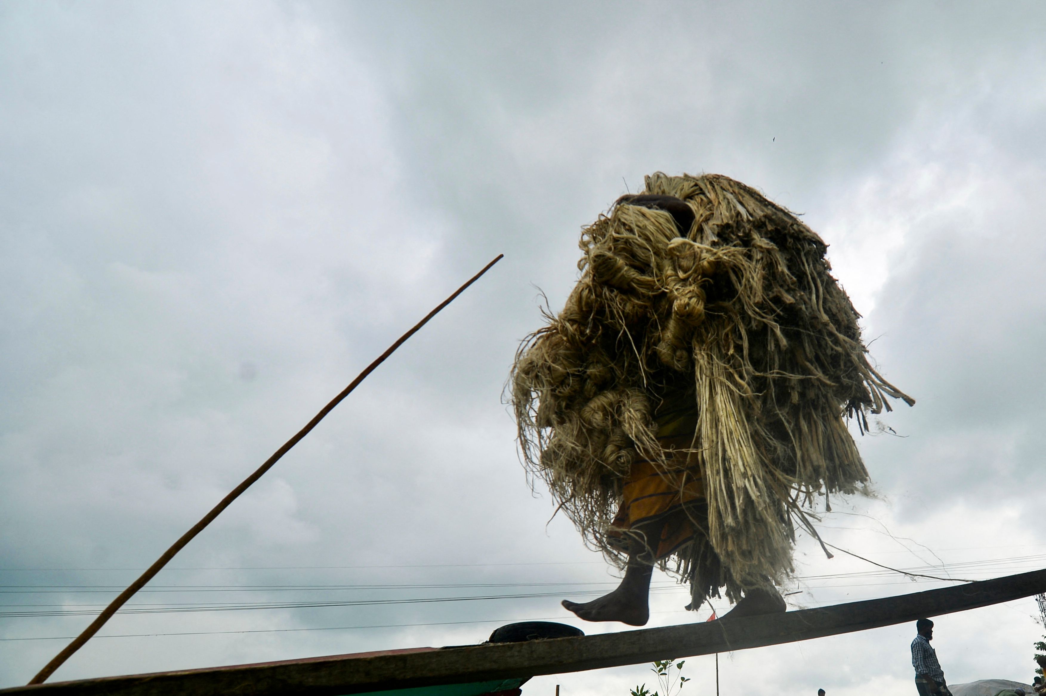 A worker carries jute to load on a boat at a rural market in Munshigonj, Bangladesh, on Sept 17, 2021.
