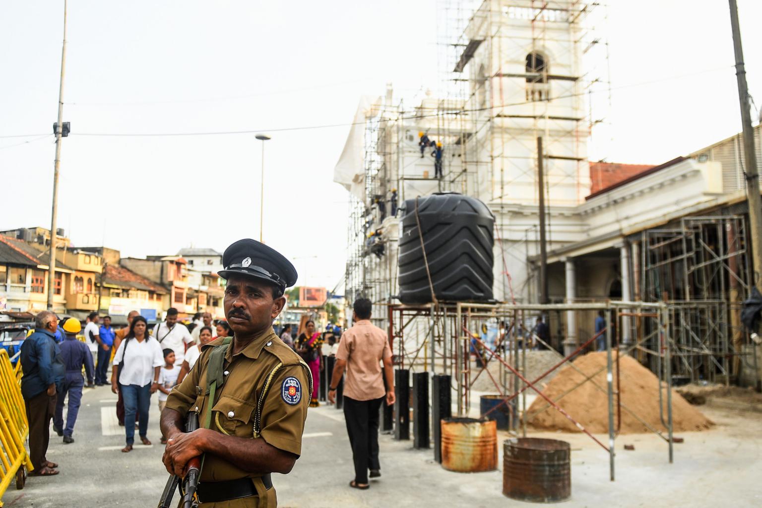A Sri Lankan policeman stands guard as Catholic devotees take part in a remembrance ceremony in front of St Anthony's Church in Colombo on May 21, 2019.