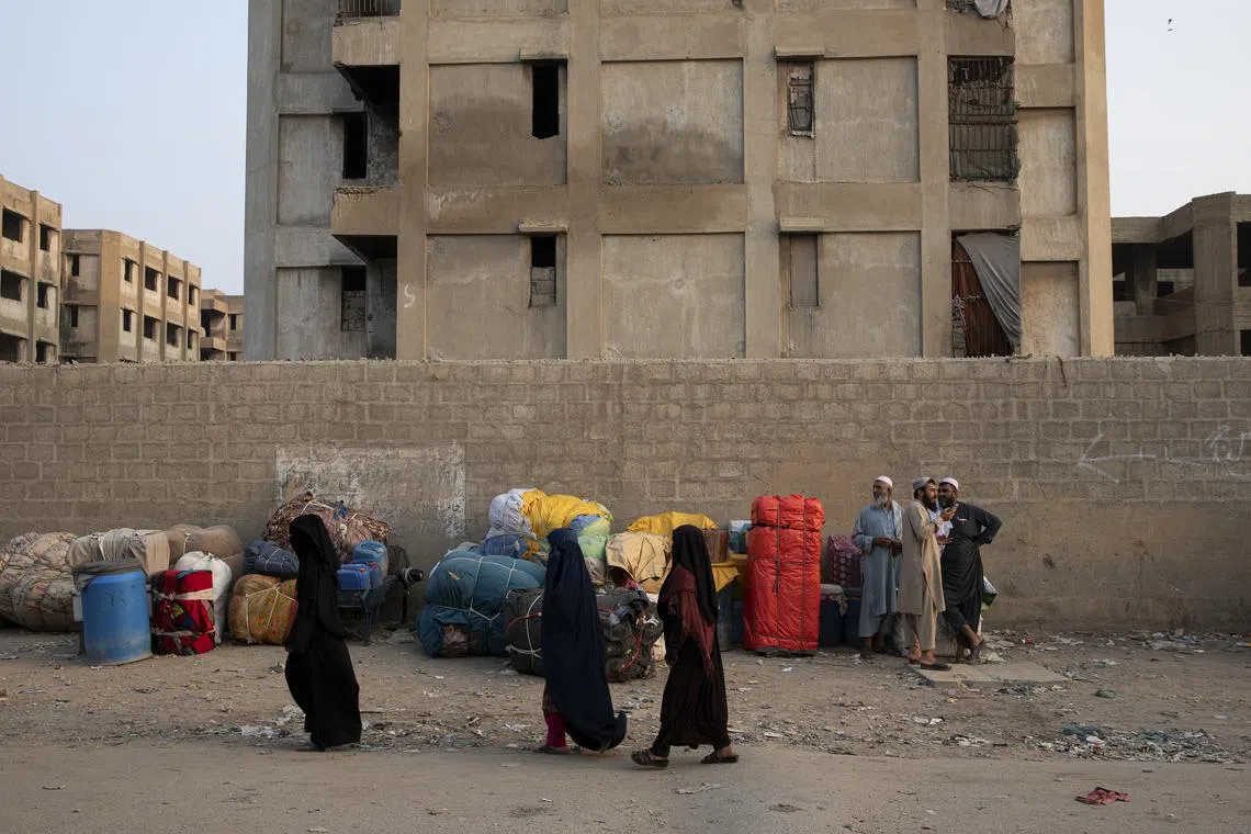 Afghan migrants with their belongings near a bus terminal in Karachi, Pakistan, before making their way back to Afghanistan to comply with a deportation order, on Nov 21, 2023.
