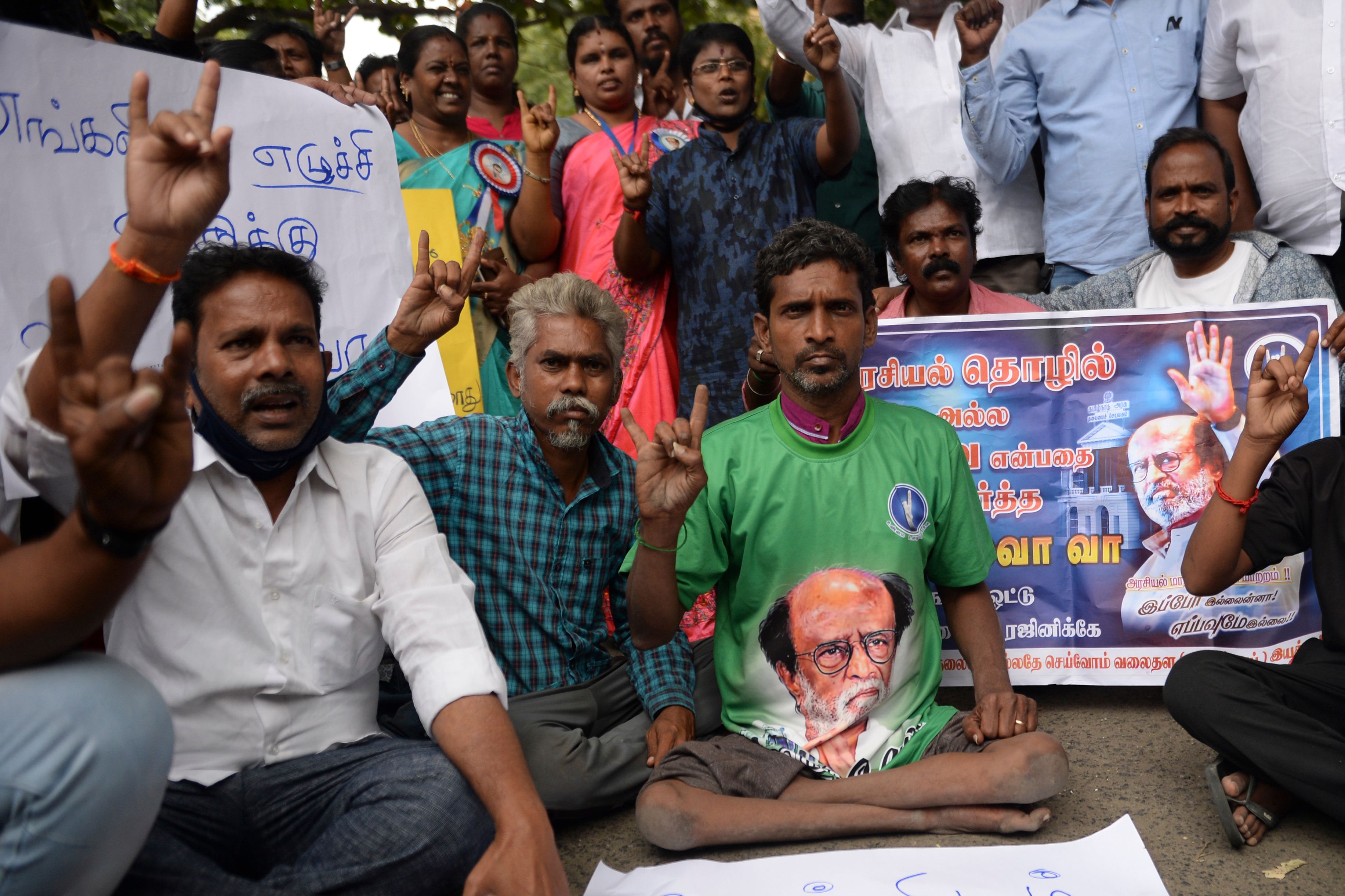 Fans of actor Rajinikanth hold placards near his residence asking him to enter politics in Chennai on Dec 30, 2020.