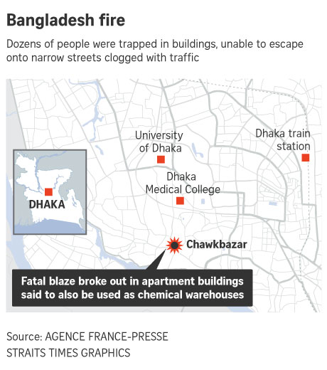 The fire started in a four-storey building around 10.40pm on Wednesday (12.40am Thursday morning, Singapore time) and spread to nearby buildings in the Chawkbazar area of Old Dhaka, which dates back to the Mughal period more than 300 years ago.