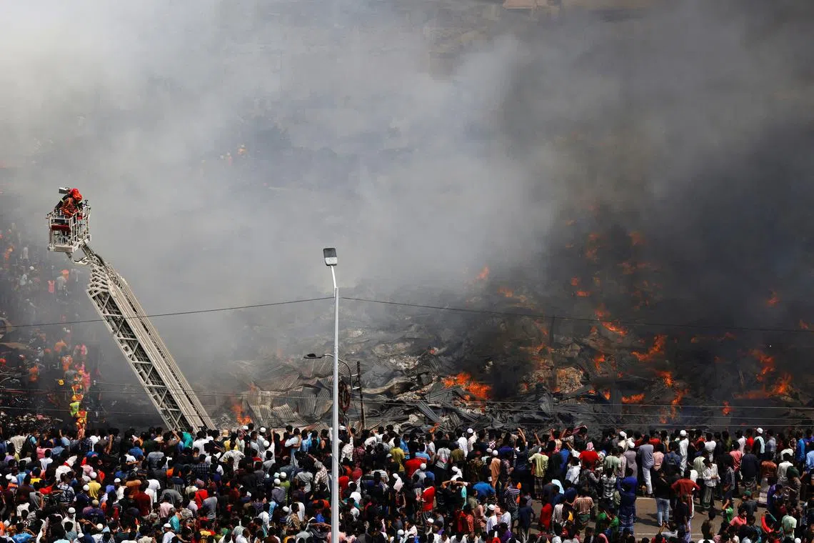 Firefighters run out of water as they try to douse a fire that broke out in a clothing market in Dhaka, Bangladesh.