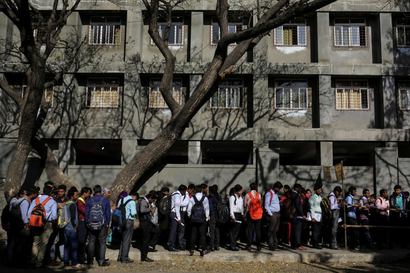 Jobseekers line up outside the venue of a job fair in Chinchwad, India, on Feb 7, 2019.