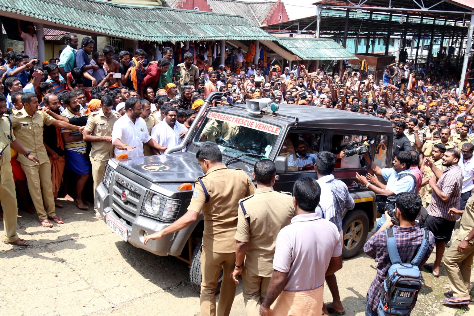 A police van, believed to be carrying a woman, surrounded by protesters near the Sabarimala temple at Pamba, Kerala, on Oct 21, 2018.