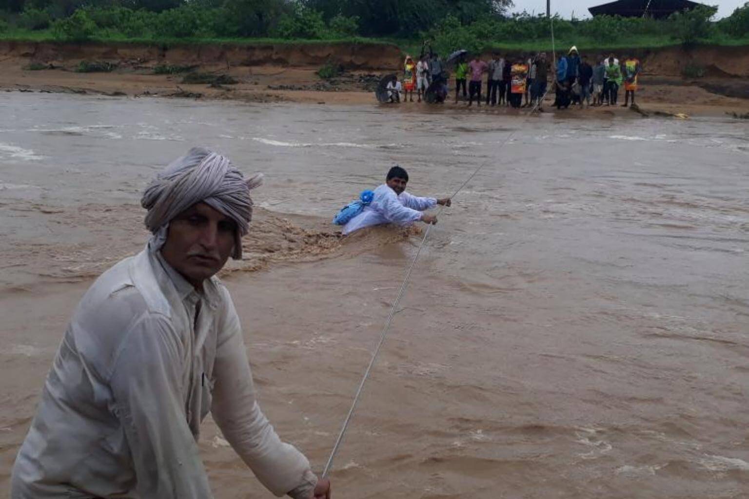 Indian men trying to cross flood waters in Deesa municipality, which has been hit by severe flooding along the Banas River in northern Gujarat state in western India on July 25, 2017.