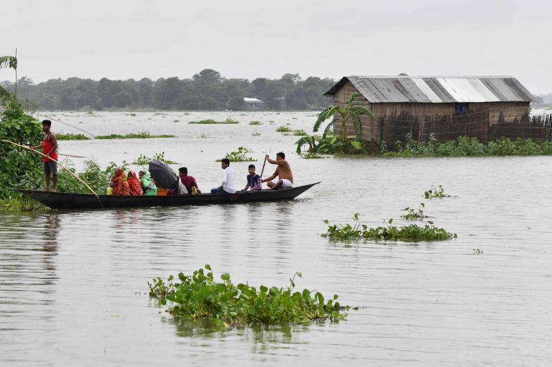 Indian villagers travel by boat through floodwaters near a partially submerged house in Balimukh village of Morigoan district in India's northeastern state of Assam on July 11, 2019.