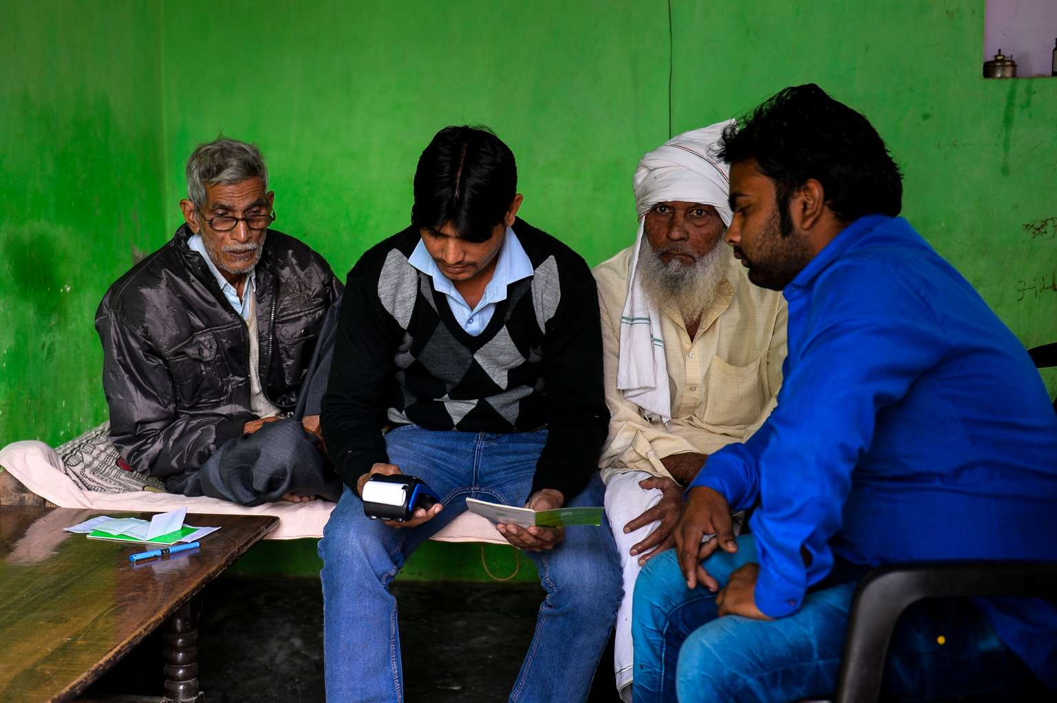 Bank correspondent Mohammad Imran (second from left) inputs bank details of villagers on a mobile banking machine in Basendua village in Bulandshahr, in northern Uttar Pradesh state.