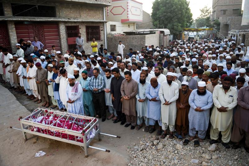 Residents offer a funeral prayer for a train fire victim in Mirpurkhas on Nov 1, 2019.