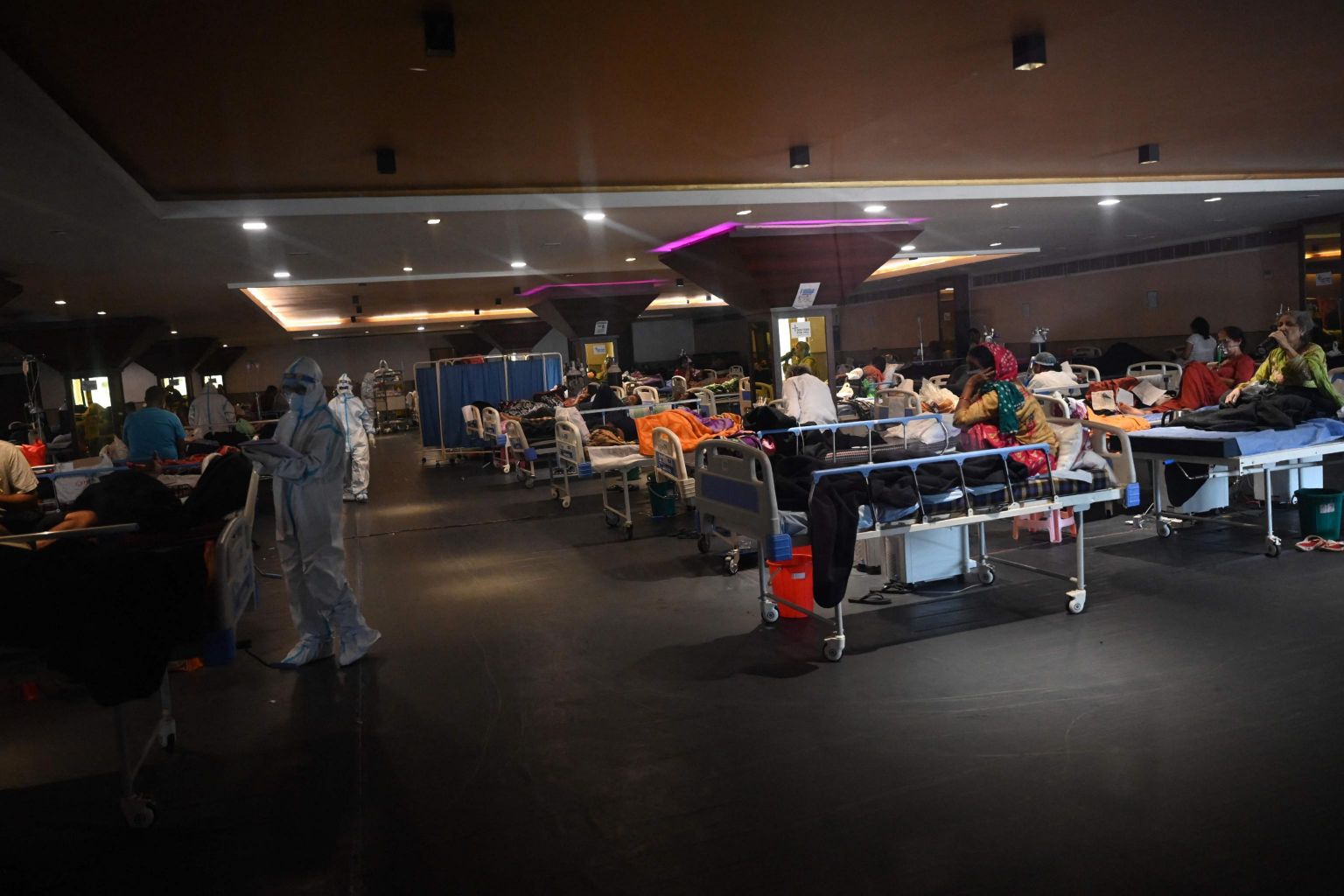Patients are seen inside a banquet hall temporarily converted into a Covid-19 ward in New Delhi on April 27, 2021.