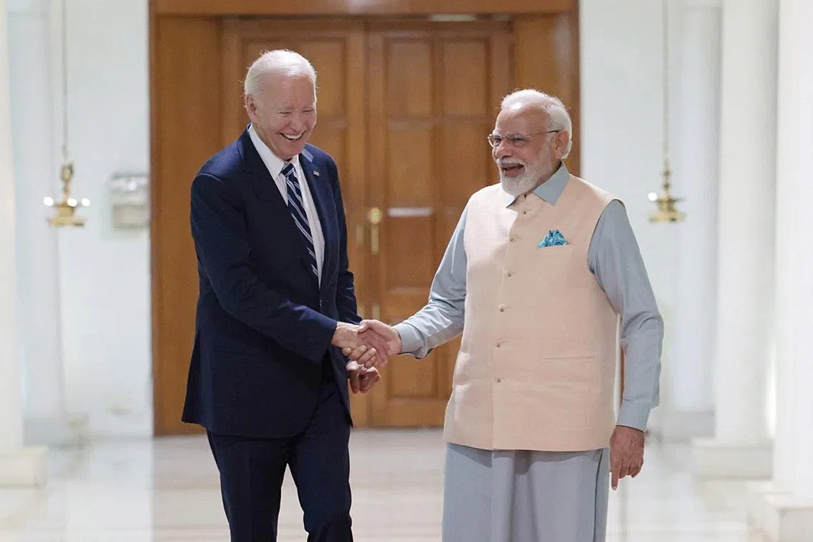 Indian Prime Minister Narendra Modi (right) welcoming US President Joe Biden to New Delhi on Sept 8, ahead of the G-20 summit.