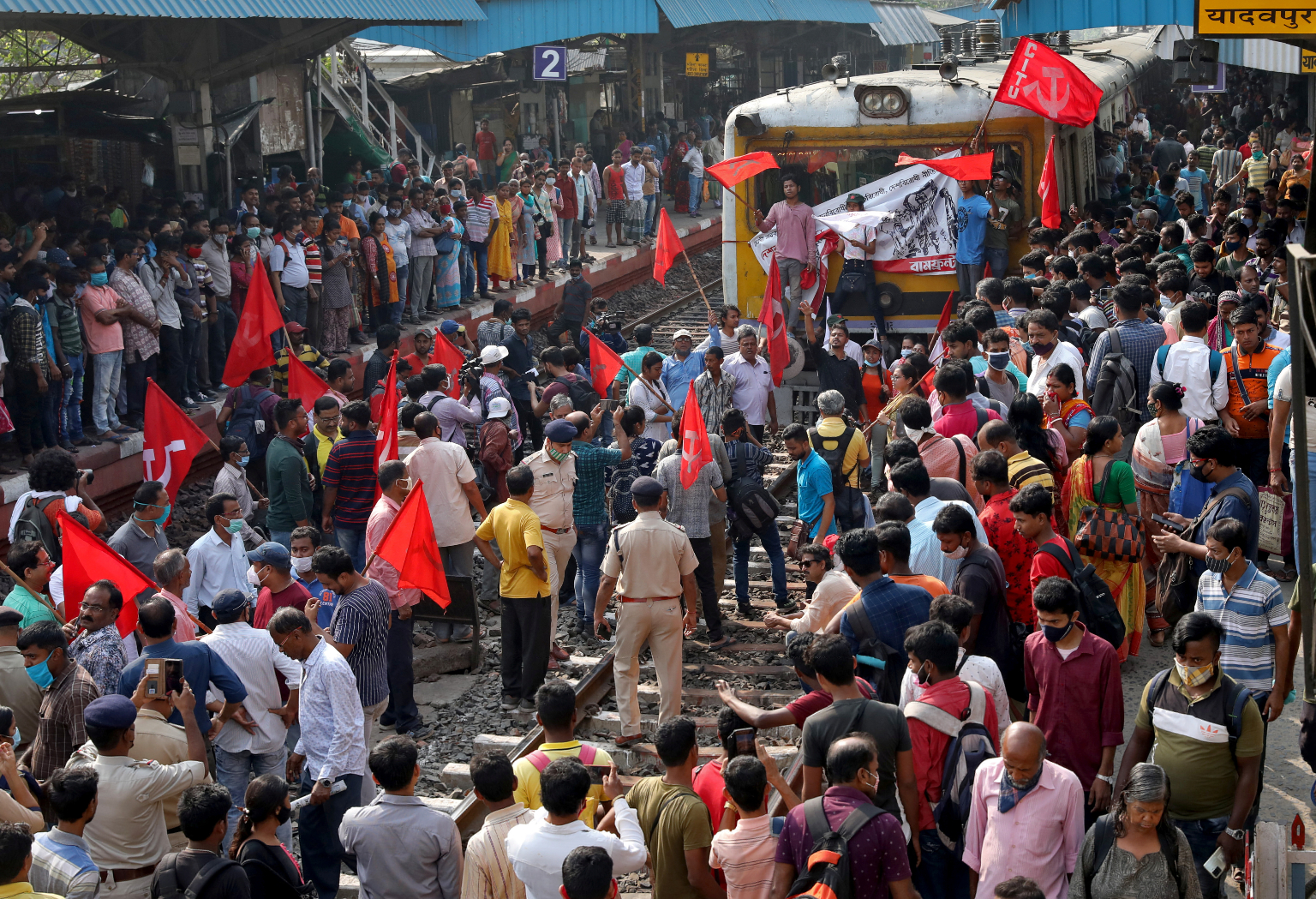 Demonstrators block a passenger train during a two-day long strike in Kolkata, on March 28, 2022.