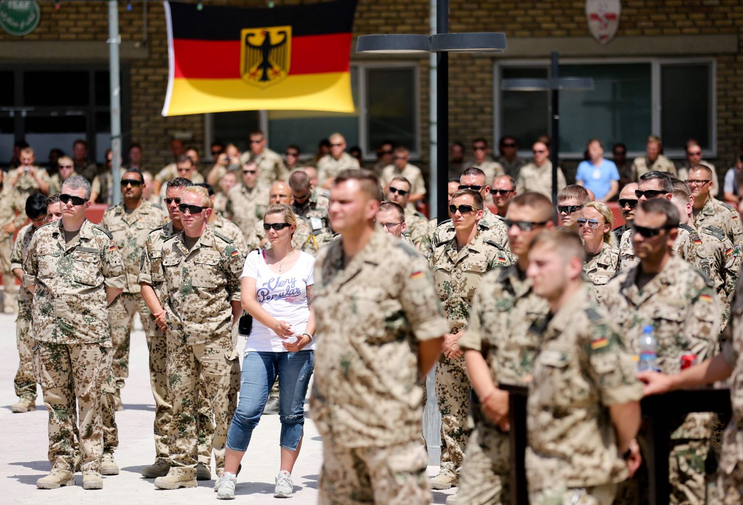 A 2013 photo shows Bundeswehr soldiers listening to a speech by the German Chancellor in Mazar-i-Sharif, Afghanistan.