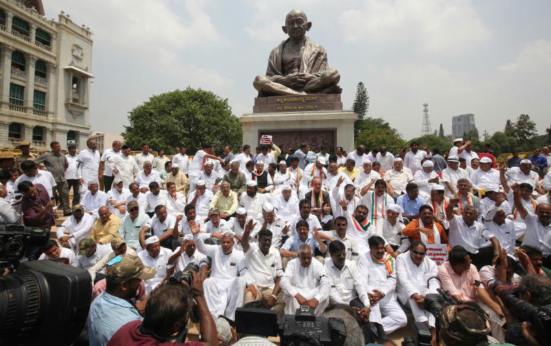 Members gather in front of a Gandhi Statue during a joint Congress party and secular Janata Dal (JD) protest against Karnataka governor Valubhai Vala and Indian Prime Minister Narendra Modi, in Bangalore, India on May 17, 2018.