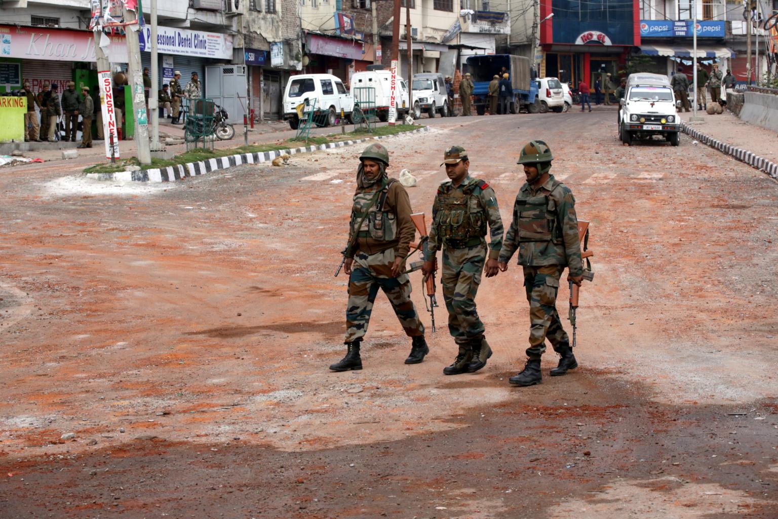Indian army soldiers patrol during curfew in Jammu, the winter capital of Kashmir, India on Feb 17, 2019.