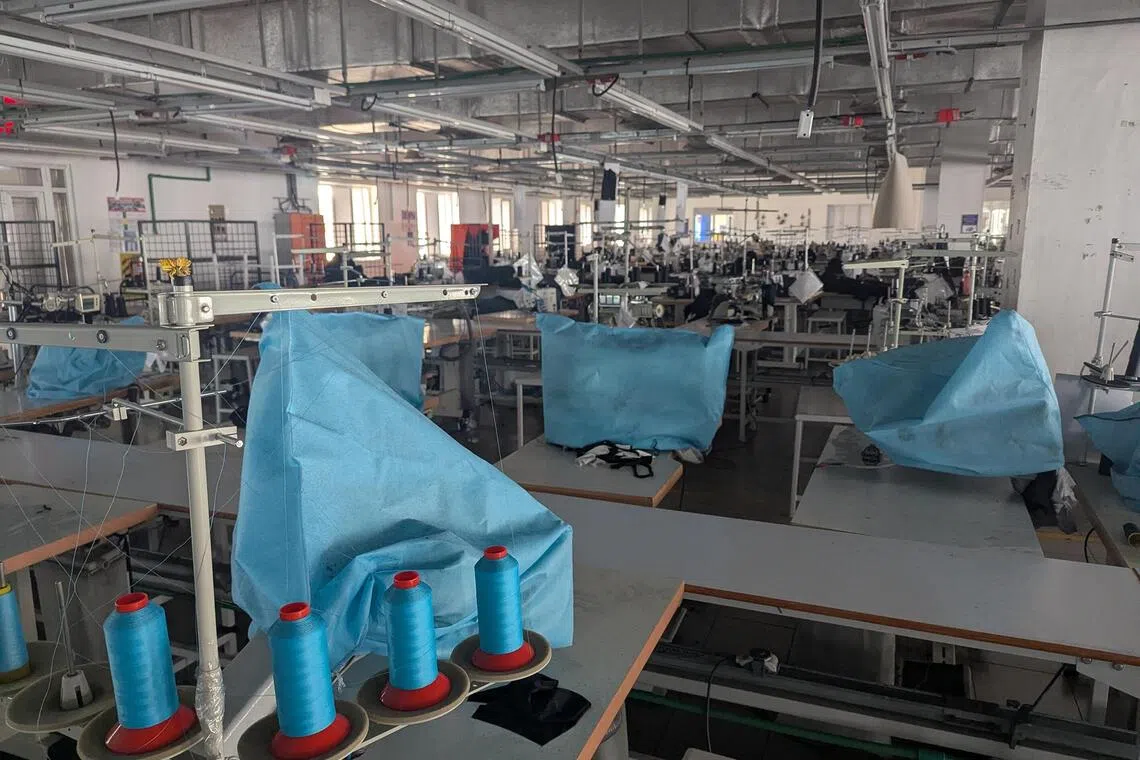 Of the 15 lines of sewing machines at its factory at the Netaji Apparel Park in Tiruppur, only five were in operation when ST visited, with the machines that were not in use covered with blue plastic.