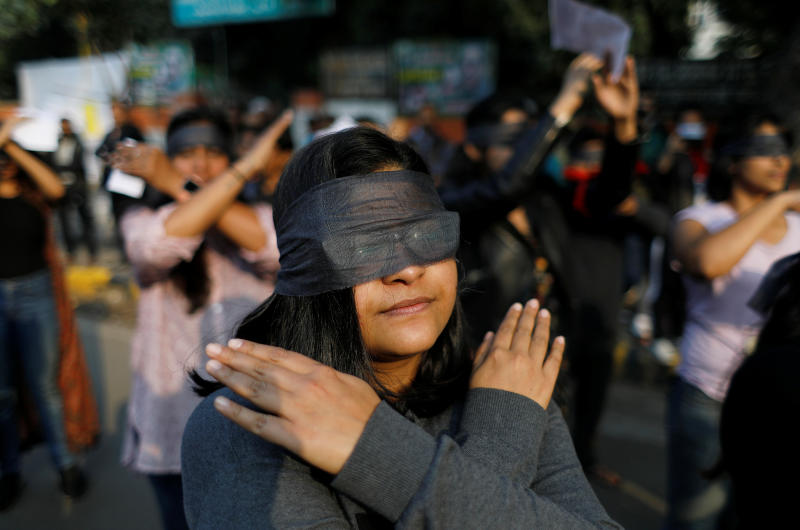 In a photo taken on Dec 7, 2019, protesters wearing blindfolds take part in a Delhi protest in solidarity with rape victims and to oppose violence against women in India.