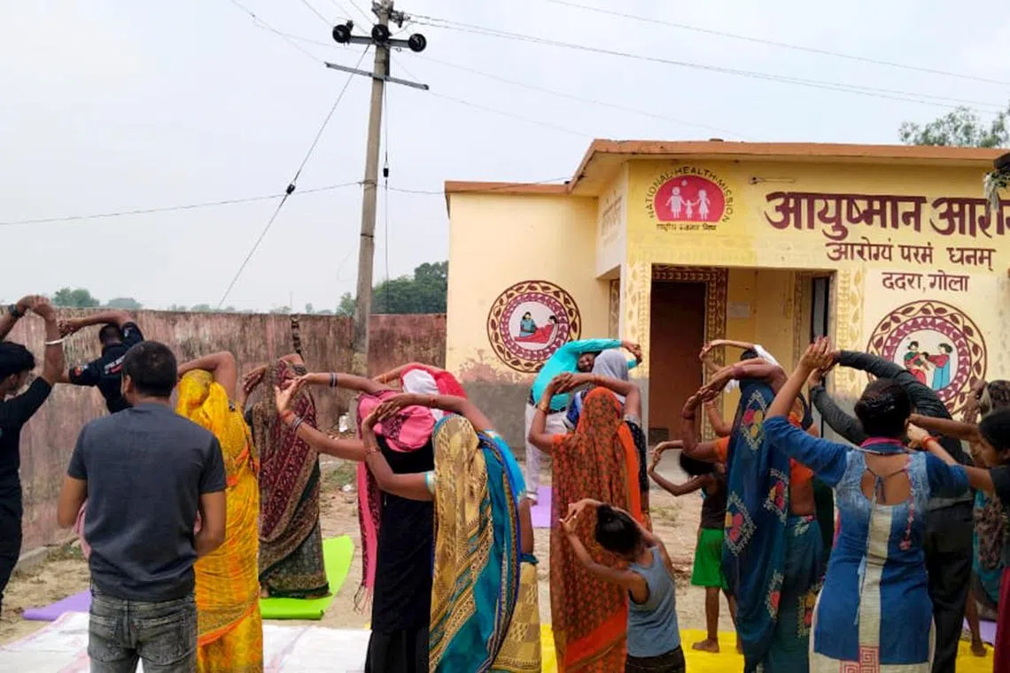Locals at a yoga session being organised at the Ayushman Arogya Mandir government health centre in Dadra, Uttar Pradesh.