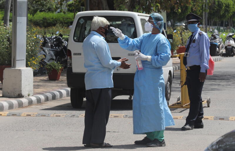 A health worker conducts temperature checks on people entering a hospital in New Delhi on April 10, 2020.