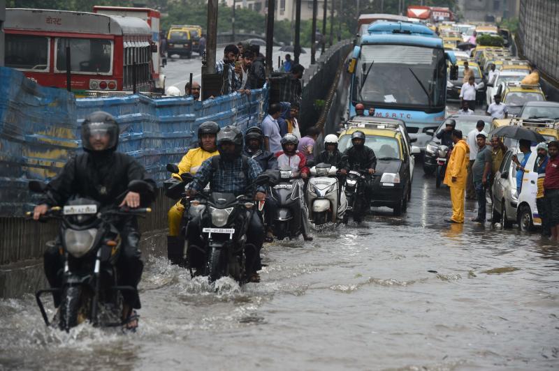 Indian motorists drive along a flooded street after heavy rain showers in Mumbai on July 1, 2019.